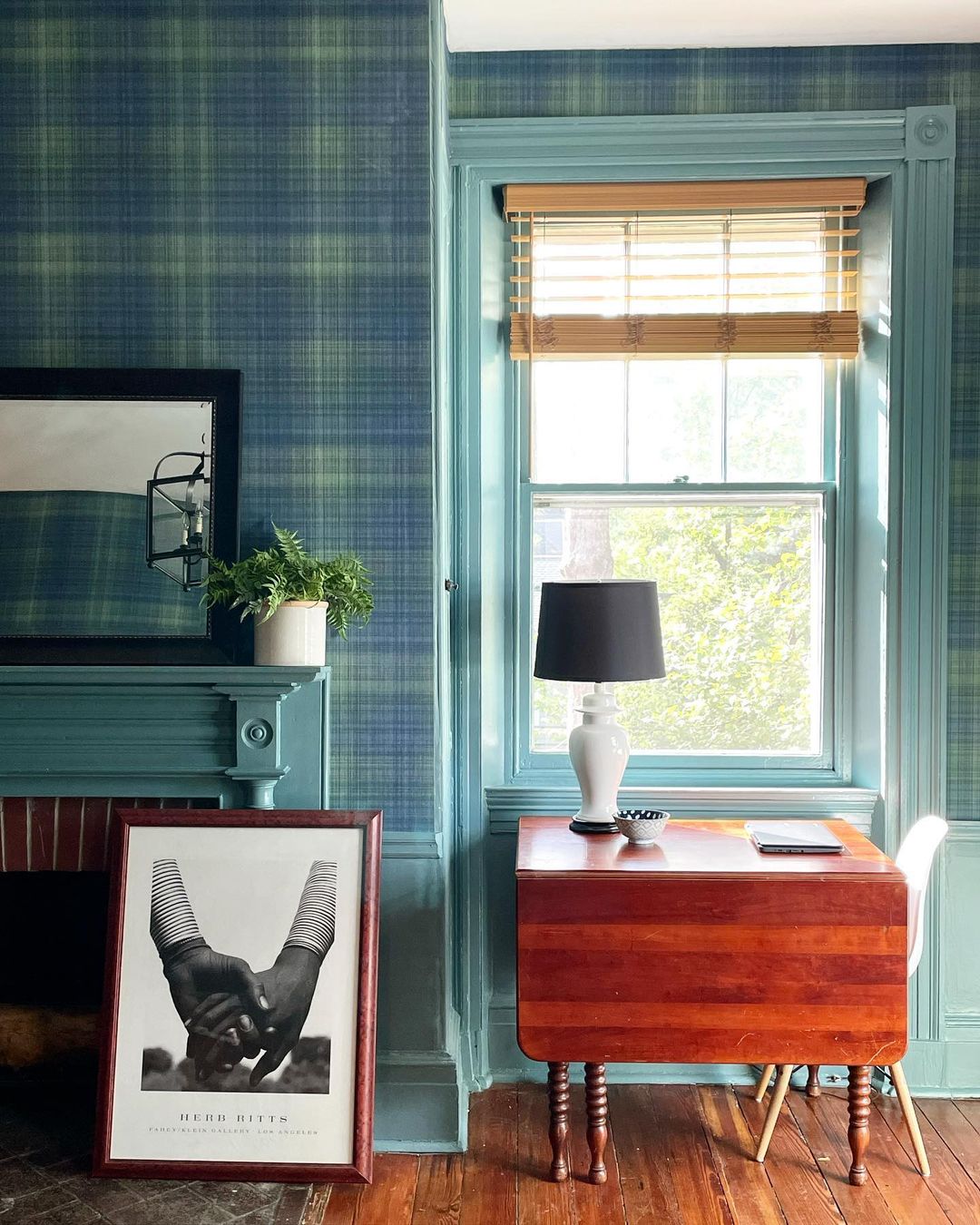 Great paint color for trim and goes perfectly with the plaid wallpaper in this boys bedroom. Via thomasredmanhouse.