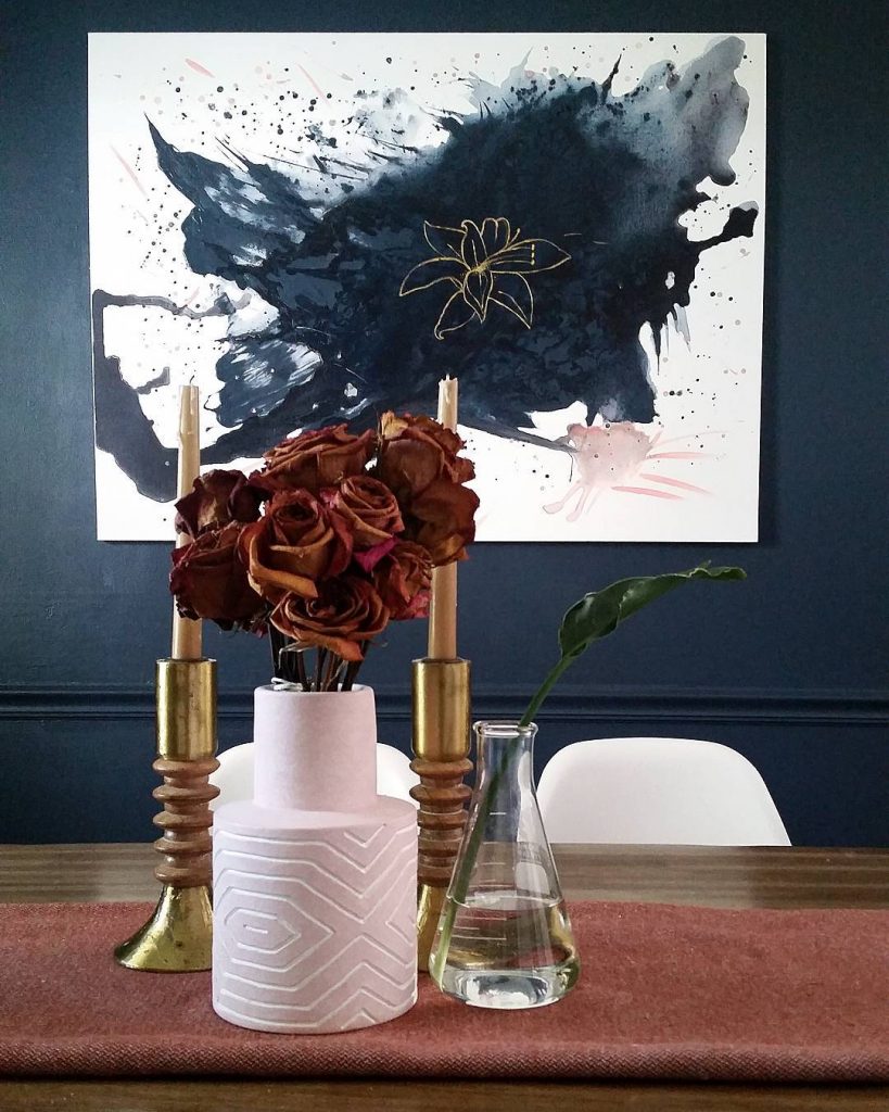 Combine paint color Benjamin Moore Hale Navy with florals, pastel pinks and white details for a bohemian vibe! (see more of this home: via).