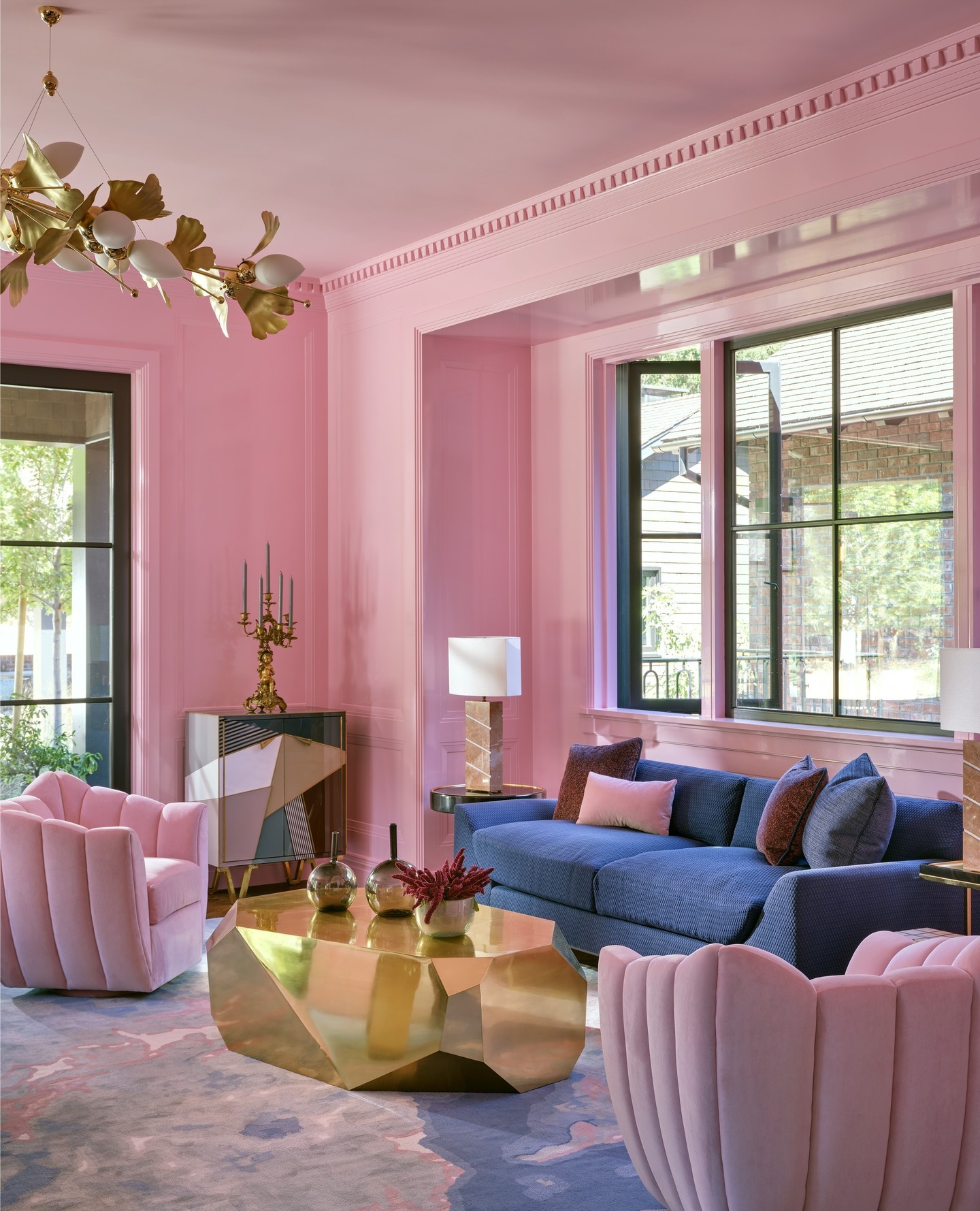 Benjamin Moore May Flowers 1324. This bubbly shade of pink offers vibrant versatility. This bubbly shade infuses your space with an invigorating energy that seamlessly blends vibrant playfulness with elegant style. Amazing blue and pink living room designed by Kendall Wilkinson Design.