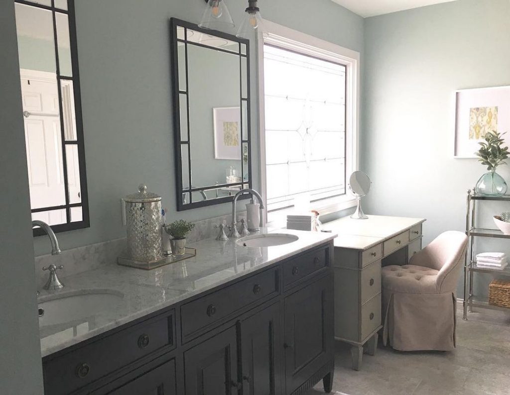 Bathroom painted in Woodland Blue. Via esdinteriors.