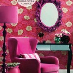 In this entryway designed by Ned Marshall, the hot pink sofa is a knockout against walls painted Benjamin Moore’s Bittersweet Chocolate. Marshall painted the floors in a tone-on-tone gray marbleized plaid. via House Beautiful.