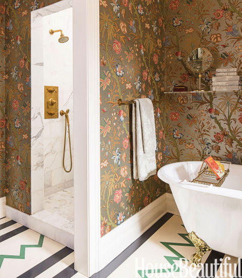 Lean back in the Vintage Imperial Clawfoot Soaking Tub by Restoration Hardware, and it feels as if you’re bathing in a bower, thanks to the Arabella wallpaper in Platinum by Cowtan & Tout. Floor-mounted tub filler included with tub.