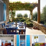 Modern lines and curves with a geometric table in blonde wood. Walls and velvet curtains in royal purple add a touch of luxury.