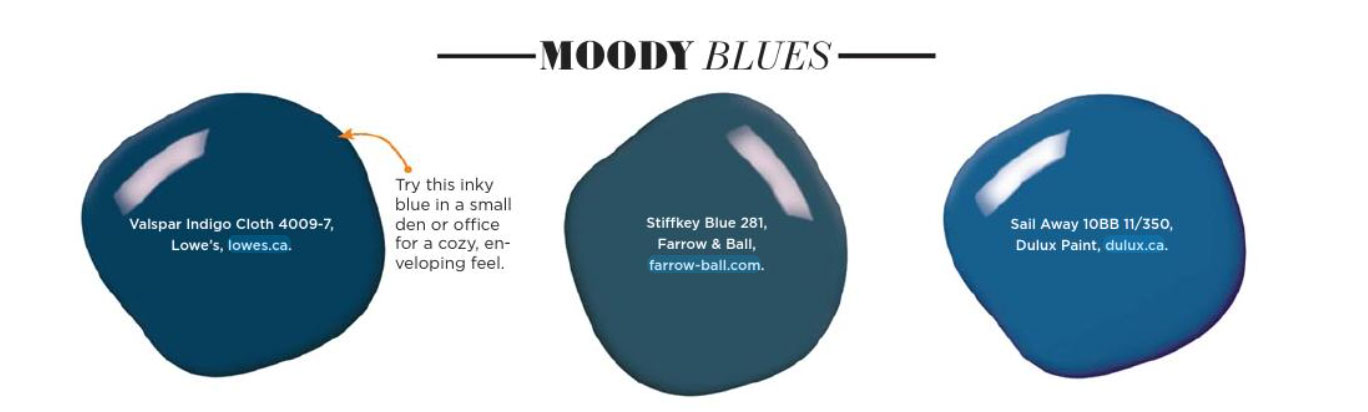 Paint Palette – Moody Bluesby Interiors By ColorMay 3, 2014March 7, 2017Looking to give your wall a fresh coat of paint? Here are some amazing colors trending for 2014.Valspar Indigo Cloth by Lowe’sStiffkey Blue by Fallow and BallSail Away by Dulux More Like This Blue Paint Colors 2020 All About Indigo Farrow & Ball Elephant’s Breath Popular Yellow Paint Colors CollectionTags:blue paint color palettesDulux Sail AwayFarrow & Ball Stiffkey BlueValspar Indigo ClothLeave a Reply Cancel replyYour email address will not be published. Required fields are marked *Name * Email * Website Comment * Δ
