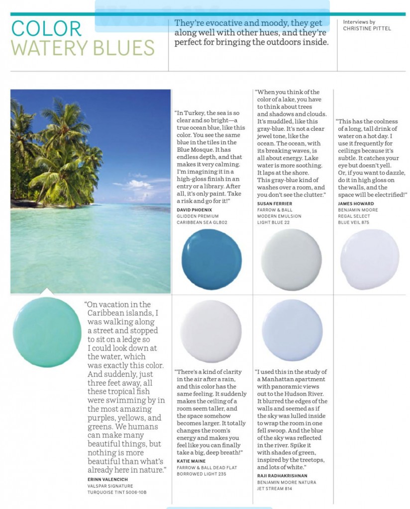 Paint Palette – Watery Bluesby Interiors By ColorMarch 19, 2014Watery Blue paint color scheme from House Beautiful US March 2014.“They’re evocative and moody, they get along well with other hues, and they’re perfect for bringing the outdoors inside.” More Like This Blue Paint Colors 2020 Serendipity Kim Alexandriuk Interior Design in Marie Claire Maison Italia March 2014 Blue Kitchen Cabinets AustraliaLeave a Reply Cancel replyYour email address will not be published. Required fields are marked *Name * Email * Website Comment * Δ